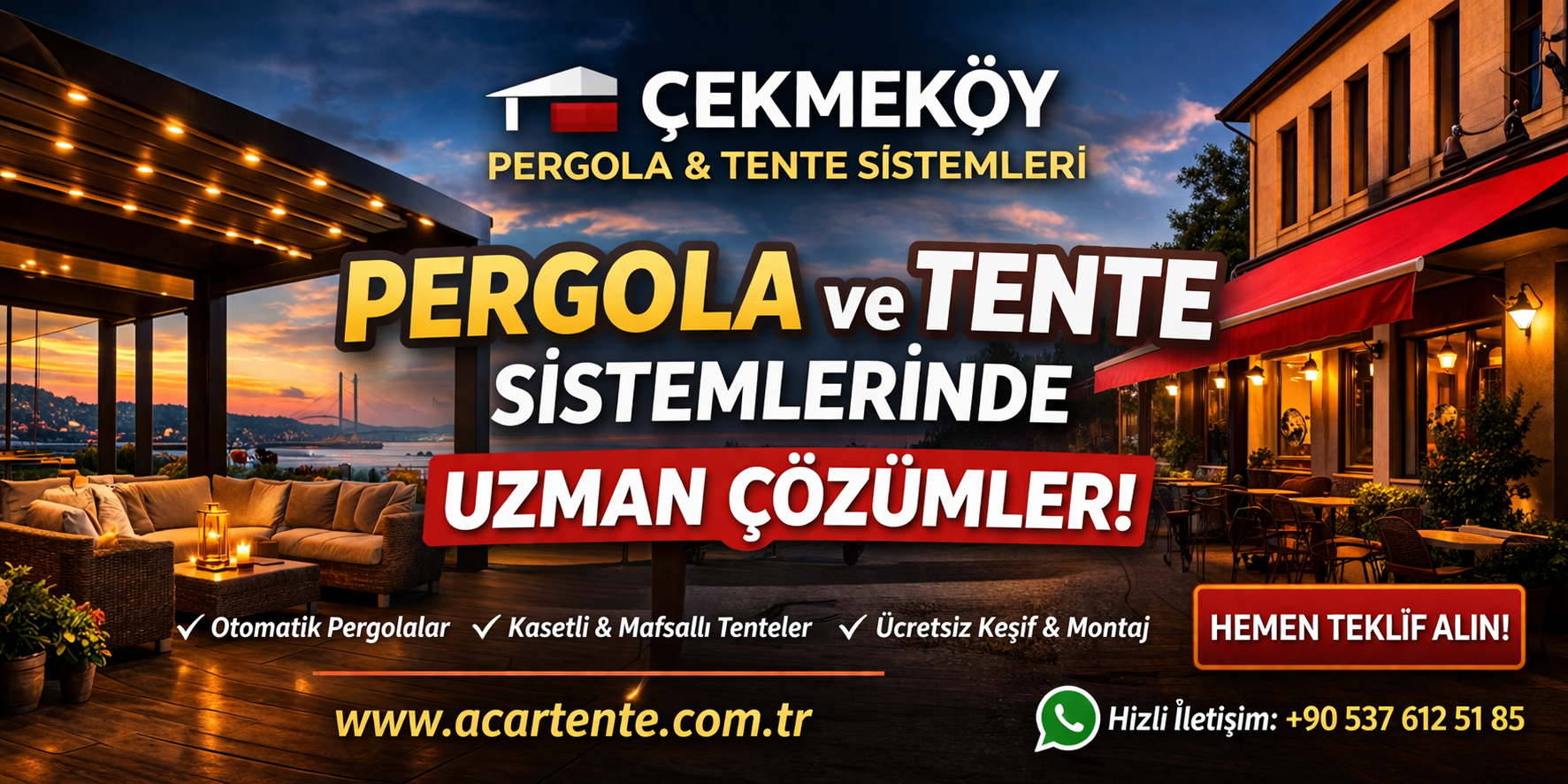 Çekmeköy sabit tente sistemleri, dayanıklı yapısı ile uzun ömürlü kullanım sunar ve mekanlarınıza estetik katkı sağlar.
